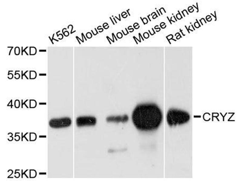 - Crystallins are separated into two classes: taxon-specific, or enzyme, and ubiquitous. The latter class constitutes the major proteins of vertebrate eye lens and maintains the transparency and refractive index of the lens. The former class is also called phylogenetically-restricted crystallins. This gene encodes a taxon-specific crystallin protein which has NADPH-dependent quinone reductase activity distinct from other known quinone reductases. It lacks alcohol dehydrogenase activity although by similarity it is considered a member of the zinc-containing alcohol dehydrogenase family. Unlike other mammalian species, in humans, lens expression is low. Alternatively spliced transcript variants encoding different isoforms have been found for this gene. One pseudogene is known to exist.,CRYZ,Epigenetics & Nuclear Signaling,Cancer,Signal Transduction,Endocrine & Metabolism,Nucleotide metabolism,Drug metabolism,Neuroscience,CRYZ