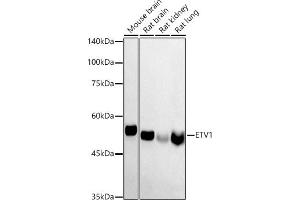 - This gene encodes a member of the ETS (E twenty-six) family of transcription factors. The ETS proteins regulate many target genes that modulate biological processes like cell growth, angiogenesis, migration, proliferation and differentiation. All ETS proteins contain an ETS DNA-binding domain that binds to DNA sequences containing the consensus 5'-CGGA[AT]-3'. The protein encoded by this gene contains a conserved short acidic transactivation domain (TAD) in the N-terminal region, in addition to the ETS DNA-binding domain in the C-terminal region. This gene is involved in chromosomal translocations, which result in multiple fusion proteins including EWS-ETV1 in Ewing sarcoma and at least 10 ETV1 partners (see PMID: 19657377, Table 1) in prostate cancer. In addition to chromosomal rearrangement, this gene is overexpressed in prostate cancer, melanoma and gastrointestinal stromal tumor. Multiple alternatively spliced transcript variants encoding different isoforms have been identified.,ETV1,ER81,Epigenetics & Nuclear Signaling,Transcription Factors,Signal Transduction,MAPK-Erk Signaling Pathway,MAPK-P38 Signaling Pathway,Neuroscience,Stem Cells,Hematopoietic Progenitors,ETV1