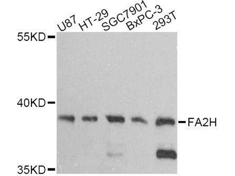 This gene encodes a protein that catalyzes the synthesis of 2-hydroxysphingolipids, a subset of sphingolipids that contain 2-hydroxy fatty acids. Sphingolipids play roles in many cellular processes and their structural diversity arises from modification of the hydrophobic ceramide moiety, such as by 2-hydroxylation of the N-acyl chain, and the existence of many different head groups. Mutations in this gene have been associated with leukodystrophy dysmyelinating with spastic paraparesis with or without dystonia.,FA2H,FAAH,FAH1,FAXDC1,SCS7,SPG35,Signal Transduction,Endocrine & Metabolism,Lipid Metabolism,Neuroscience,Cell Type Marker,Neuron marker,Axon marker,FA2H