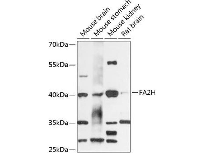 This gene encodes a protein that catalyzes the synthesis of 2-hydroxysphingolipids, a subset of sphingolipids that contain 2-hydroxy fatty acids. Sphingolipids play roles in many cellular processes and their structural diversity arises from modification of the hydrophobic ceramide moiety, such as by 2-hydroxylation of the N-acyl chain, and the existence of many different head groups. Mutations in this gene have been associated with leukodystrophy dysmyelinating with spastic paraparesis with or without dystonia.,FA2H,FAAH,FAH1,FAXDC1,SCS7,SPG35,Signal Transduction,Endocrine & Metabolism,Lipid Metabolism,Neuroscience,Cell Type Marker,Neuron marker,Axon marker,FA2H