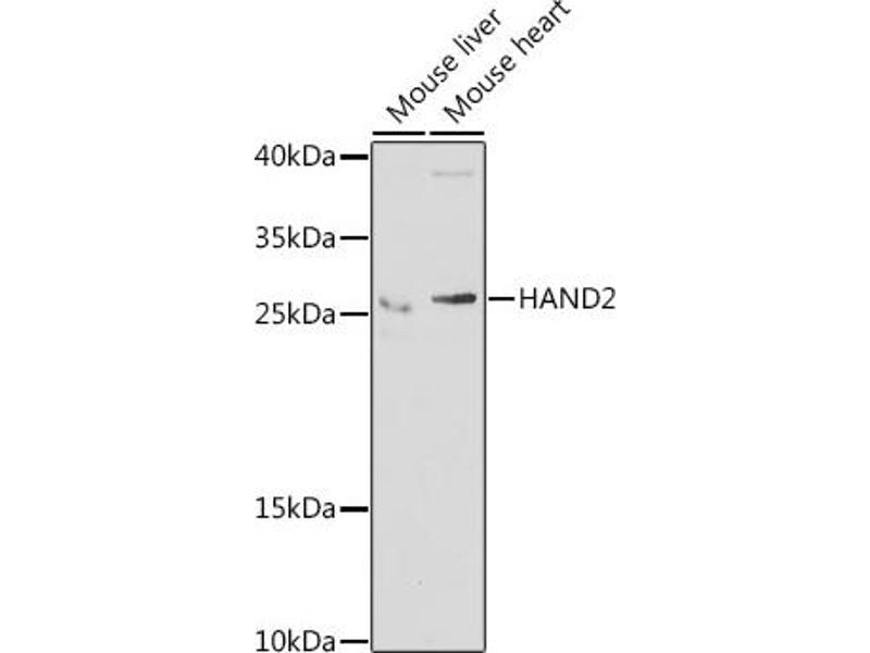 The protein encoded by this gene belongs to the basic helix-loop-helix family of transcription factors. This gene product is one of two closely related family members, the HAND proteins, which are asymmetrically expressed in the developing ventricular chambers and play an essential role in cardiac morphogenesis. Working in a complementary fashion, they function in the formation of the right ventricle and aortic arch arteries, implicating them as mediators of congenital heart disease. In addition, this transcription factor plays an important role in limb and branchial arch development.,HAND2,DHAND2,Hed,Thing2,bHLHa26,dHand,Epigenetics & Nuclear Signaling,Transcription Factors,Cell Biology & Developmental Biology,Apoptosis,Neuroscience,Cardiovascular,Angiogenesis,Heart,Cardiogenesis,Hypertrophy,HAND2