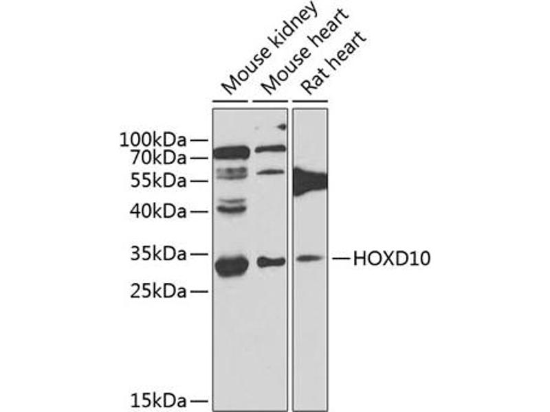 This gene is a member of the Abd-B homeobox family and encodes a protein with a homeobox DNA-binding domain. It is included in a cluster of homeobox D genes located on chromosome 2. The encoded nuclear protein functions as a sequence-specific transcription factor that is expressed in the developing limb buds and is involved in differentiation and limb development. Mutations in this gene have been associated with Wilm's tumor and congenital vertical talus (also known as 'rocker-bottom foot' deformity or congenital convex pes valgus) and/or a foot deformity resembling that seen in Charcot-Marie-Tooth disease.,HOXD10,HOX4,HOX4D,HOX4E,Hox-4.4,Epigenetics & Nuclear Signaling,Transcription Factors,HOXD10