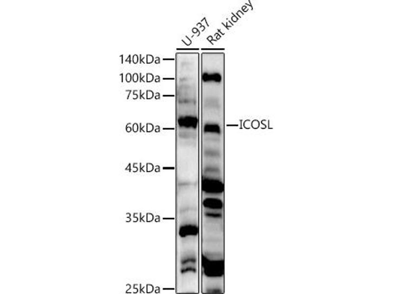 - Inducible co-stimulator ligand (ICOSL), also known as B7-H2, is a member of the B7 family of co-stimulatory molecules related to B7-1 and B7-2. It is a transmembrane glycoprotein with extracellular IgV and IgC domains, and binds to ICOS on activated T cells, thus delivers a positive costimulatory signal for optimal T cell function. The structural features of ICOSL are crucial for its costimulatory function. Present study shows that ICOSL displays a marked oligomerization potential, resembling more like B7-1 than B7-2. B7-H2-dependent signaling may play an active role in a proliferative response rather than in cytokine and chemokine production. The CD28/B7 and ICOS/B7-H2 pathways are both critical for costimulating T cell immune responses. Deficiency in either pathway results in defective T cell activation, cytokine production and germinal center formation.,ICOSLG,B7-H2,B7H2,B7RP-1,B7RP1,CD275,GL50,ICOS-L,ICOSL,LICOS,Immunology & Inflammation,CD markers,ICOSLG