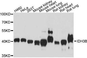 - Isocitrate dehydrogenases catalyze the oxidative decarboxylation of isocitrate to 2-oxoglutarate. These enzymes belong to two distinct subclasses, one of which utilizes NAD(+) as the electron acceptor and the other NADP(+). Five isocitrate dehydrogenases have been reported: three NAD(+)-dependent isocitrate dehydrogenases, which localize to the mitochondrial matrix, and two NADP(+)-dependent isocitrate dehydrogenases, one of which is mitochondrial and the other predominantly cytosolic. NAD(+)-dependent isocitrate dehydrogenases catalyze the allosterically regulated rate-limiting step of the tricarboxylic acid cycle. Each isozyme is a heterotetramer that is composed of two alpha subunits, one beta subunit, and one gamma subunit. The protein encoded by this gene is the beta subunit of one isozyme of NAD(+)-dependent isocitrate dehydrogenase. Multiple alternatively spliced transcript variants encoding different isoforms have been described for this gene.,IDH3B,RP46,Cancer,Signal Transduction,Endocrine & Metabolism,Mitochondrial metabolism,Mitochondrial markers,IDH3B