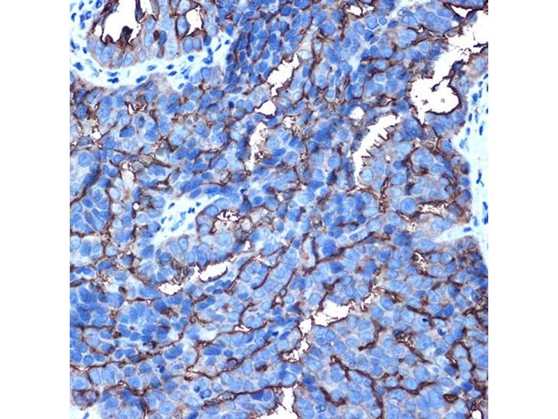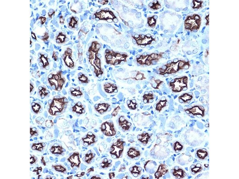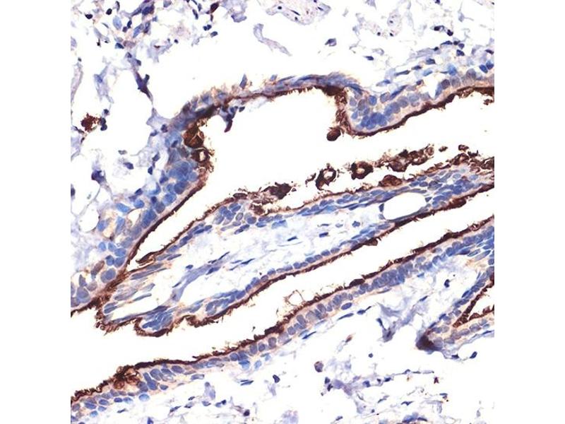 This gene encodes a membrane-bound protein that is a member of the mucin family. Mucins are O-glycosylated proteins that play an essential role in forming protective mucous barriers on epithelial surfaces. These proteins also play a role in intracellular signaling. This protein is expressed on the apical surface of epithelial cells that line the mucosal surfaces of many different tissues including lung, breast stomach and pancreas. This protein is proteolytically cleaved into alpha and beta subunits that form a heterodimeric complex. The N-terminal alpha subunit functions in cell-adhesion and the C-terminal beta subunit is involved in cell signaling. Overexpression, aberrant intracellular localization, and changes in glycosylation of this protein have been associated with carcinomas. This gene is known to contain a highly polymorphic variable number tandem repeats (VNTR) domain. Alternate splicing results in multiple transcript variants.,ADMCKD,ADMCKD1,CA 15-3,CD227,EMA,H23AG,KL-6,MAM6,MCD,MCKD,MCKD1,MUC-1,MUC-1/SEC,MUC-1/X,MUC1/ZD,PEM,PEMT,PUM,MUC1,CA15-3,mucin-1,Cancer,Tumor immunology,Tumor-associated antigens,Invasion and Metastasis,Signal Transduction,ErbB-HER Signaling Pathway,Cell Biology & Developmental Biology,Cytoskeleton,Extracellular Matrix,Immunology & Inflammation,CD markers,MUC1