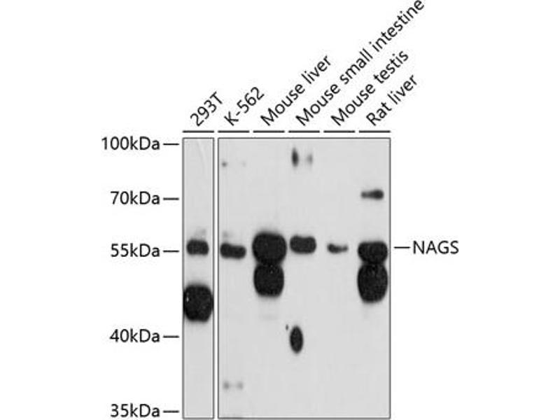 The N-acetylglutamate synthase gene encodes a mitochondrial enzyme that catalyzes the formation of N-acetylglutamate (NAG) from glutamate and acetyl coenzyme-A. NAG is a cofactor of carbamyl phosphate synthetase I (CPSI), the first enzyme of the urea cycle in mammals. This gene may regulate ureagenesis by altering NAG availability and, thereby, CPSI activity. Deficiencies in N-acetylglutamate synthase have been associated with hyperammonemia.,NAGS,AGAS,ARGA,Cancer,Signal Transduction,Endocrine & Metabolism,Mitochondrial metabolism,Mitochondrial markers,Amino acid metabolism,NAGS