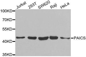 - This gene encodes a bifunctional enzyme containing phosphoribosylaminoimidazole carboxylase activity in its N-terminal region and phosphoribosylaminoimidazole succinocarboxamide synthetase in its C-terminal region. It catalyzes steps 6 and 7 of purine biosynthesis. The gene is closely linked and divergently transcribed with a locus that encodes an enzyme in the same pathway, and transcription of the two genes is coordinately regulated. The human genome contains several pseudogenes of this gene. Multiple transcript variants encoding different isoforms have been found for this gene.,PAICS,ADE2,ADE2H1,AIRC,PAIS,Epigenetics & Nuclear Signaling,Signal Transduction,Endocrine & Metabolism,Nucleotide metabolism,PAICS