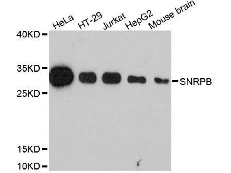The protein encoded by this gene is one of several nuclear proteins that are found in common among U1, U2, U4/U6, and U5 small ribonucleoprotein particles (snRNPs). These snRNPs are involved in pre-mRNA splicing, and the encoded protein may also play a role in pre-mRNA splicing or snRNP structure. Autoantibodies from patients with systemic lupus erythematosus frequently recognize epitopes on the encoded protein. Two transcript variants encoding different isoforms (B and B') have been found for this gene.,SNRPB,CCMS,COD,SNRPB1,Sm-B/B,SmB/SmB,snRNP-B,Epigenetics & Nuclear Signaling,Immunology & Inflammation,SNRPB