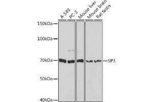 - This gene belongs to a family of Sp1 related genes that encode transcription factors that regulate transcription by binding to consensus GC- and GT-box regulatory elements in target genes. This protein contains a zinc finger DNA-binding domain and several transactivation domains, and has been reported to function as a bifunctional transcription factor that either stimulates or represses the transcription of numerous genes. Transcript variants encoding different isoforms have been described for this gene, and one has been reported to initiate translation from a non-AUG (AUA) start codon. Additional isoforms, resulting from the use of alternate downstream translation initiation sites, have also been noted. A related pseudogene has been identified on chromosome 13.,SP3,SPR2,Epigenetics & Nuclear Signaling,Transcription Factors,SP3
