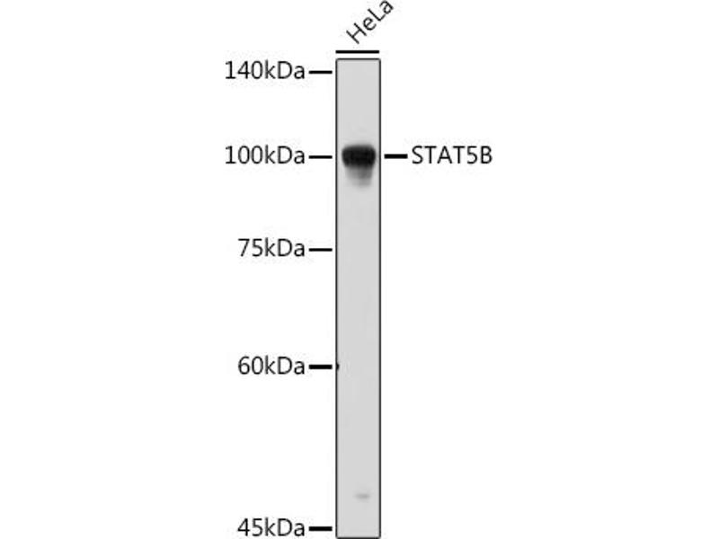 The protein encoded by this gene is a member of the STAT family of transcription factors. In response to cytokines and growth factors, STAT family members are phosphorylated by the receptor associated kinases, and then form homo- or heterodimers that translocate to the cell nucleus where they act as transcription activators. This protein mediates the signal transduction triggered by various cell ligands, such as IL2, IL4, CSF1, and different growth hormones. It has been shown to be involved in diverse biological processes, such as TCR signaling, apoptosis, adult mammary gland development, and sexual dimorphism of liver gene expression. This gene was found to fuse to retinoic acid receptor-alpha (RARA) gene in a small subset of acute promyelocytic leukemias (APLL). The dysregulation of the signaling pathways mediated by this protein may be the cause of the APLL.,STAT5,STAT5B,Epigenetics & Nuclear Signaling,Transcription Factors,Cancer,Signal Transduction,ErbB-HER Signaling Pathway,Endocrine & Metabolism,Immunology & Inflammation,IL-6 Receptor Signaling Pathway,STAT5B