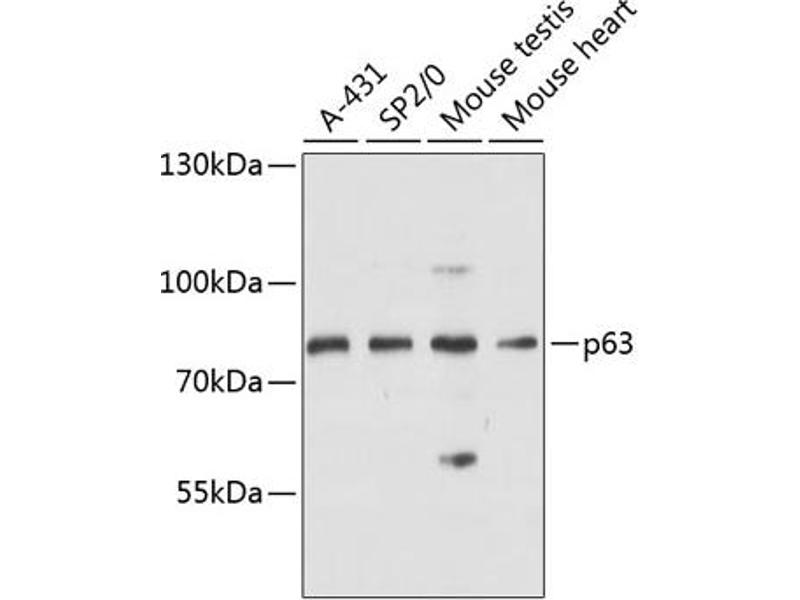 - This gene encodes a member of the p53 family of transcription factors. The functional domains of p53 family proteins include an N-terminal transactivation domain, a central DNA-binding domain and an oligomerization domain. Alternative splicing of this gene and the use of alternative promoters results in multiple transcript variants encoding different isoforms that vary in their functional properties. These isoforms function during skin development and maintenance, adult stem/progenitor cell regulation, heart development and premature aging. Some isoforms have been found to protect the germline by eliminating oocytes or testicular germ cells that have suffered DNA damage. Mutations in this gene are associated with ectodermal dysplasia, and cleft lip/palate syndrome 3 (EEC3), split-hand/foot malformation 4 (SHFM4), ankyloblepharon-ectodermal defects-cleft lip/palate, ADULT syndrome (acro-dermato-ungual-lacrimal-tooth), limb-mammary syndrome, Rap-Hodgkin syndrome (RHS), and orofacial cleft 8.,AIS,B(p51A),B(p51B),EEC3,KET,LMS,NBP,OFC8,RHS,SHFM4,TP53CP,TP53L,TP73L,p40,p51,p53CP,p63,p73H,p73L,TP63,Epigenetics & Nuclear Signaling,Transcription Factors,Cancer,Tumor suppressors,p53 pathway,Cell Biology & Developmental Biology,Apoptosis,Stem Cells,TP63