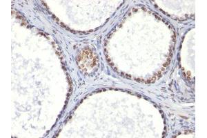 - This antibody recognizes a protein of 110 kDa, which is identified as androgen receptor (AR). It reacts with full length, and the newly described A form of the receptor. It does not cross react with estrogen, progesterone, or glucocorticoid receptors. The expression of AR is reportedly inversely correlated with histologic grade i.e. well differentiated prostate tumors show higher expression than the poorly differentiated tumors. In prostate cancer, AR has been proposed, as a marker of hormone-responsiveness and thus it may be useful in identifying patients likely to benefit from anti-androgen therapy. Anti-androgen receptor has been useful clinically in differentiating morpheaform basal cell carcinoma (mBCC) from desmoplastic trichoepithelioma (DTE) in the skin.This MAb is superb for staining of formalin/paraffin tissues. Primary antibodies are available purified, or with a selection of fluorescent CF® dyes and other labels. CF® dyes offer exceptional brightness and photostability. Note: Conjugates of blue fluorescent dyes like CF®405S and CF®405M are not recommended for detecting low abundance targets, because blue dyes have lower fluorescence and can give higher non-specific background than other dye colors.