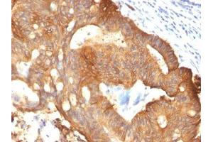 Cytokeratin 8 (CK8) belongs to the type II (or B or basic) subfamily of high molecular weight cytokeratins and exists in combination with cytokeratin 18 (CK18). CK8 is primarily found in the non-squamous epithelia and is present in majority of adenocarcinomas and ductal carcinomas. It is absent in squamous cell carcinomas. Hepatocellular carcinomas are defined by the use of antibodies that recognize only cytokeratin 8 and 18. CK8 exists on several types of normal and neoplastic epithelia, including many ductal and glandular epithelia such as colon, stomach, small intestine, trachea, and esophagus as well as in transitional epithelium. Anti-CK8 does not react with skeletal muscle or nerve cells. Epithelioid sarcoma, chordoma, and adamantinoma show strong positivity corresponding to that of simple epithelia (with antibodies against CK8, CK18 and CK19). Reportedly, anti-CK8 is useful for the differentiation of lobular (?ring-like, perinuclear?) from ductal (?peripheral-predominant?) carcinoma of the breast. Primary antibodies are available purified, or with a selection of fluorescent CF® dyes and other labels. CF® dyes offer exceptional brightness and photostability. Note: Conjugates of blue fluorescent dyes like CF®405S and CF®405M are not recommended for detecting low abundance targets, because blue dyes have lower fluorescence and can give higher non-specific background than other dye colors.
