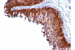 - This MAb reacts with a wide variety of simple epithelia. It does not react with stratified squamous epithelia. It reacts with epithelial tumors of the gastrointestinal tract, lung, breast, pancreas, ovary, and thyroid. Cytokeratin 18, which belongs to the type A (acidic) subfamily of low molecular weight keratins, exists in combination with cytokeratin 8. It is reported that tissues from gastrointestinal tract are positive for both cytokeratin 8 and 18 but do not contain cytokeratin 14. Tissues from gastrointestinal tract, respiratory tract and urogenital tract, as well as endocrine and exocrine tissues and mesothelial cells are positive for cytokeratin 18. Primary antibodies are available purified, or with a selection of fluorescent CF® dyes and other labels. CF® dyes offer exceptional brightness and photostability. Note: Conjugates of blue fluorescent dyes like CF®405S and CF®405M are not recommended for detecting low abundance targets, because blue dyes have lower fluorescence and can give higher non-specific background than other dye colors.