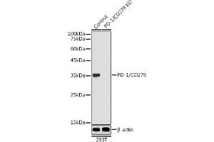 - This gene encodes a cell surface membrane protein of the immunoglobulin superfamily. This protein is expressed in pro-B-cells and is thought to play a role in their differentiation. In mice, expression of this gene is induced in the thymus when anti-CD3 antibodies are injected and large numbers of thymocytes undergo apoptosis. Mice deficient for this gene bred on a BALB/c background developed dilated cardiomyopathy and died from congestive heart failure. These studies suggest that this gene product may also be important in T cell function and contribute to the prevention of autoimmune diseases.,PDCD1,CD279,PD-1,PD1,SLEB2,hPD-1,hPD-l,hSLE1,Cell Biology & Developmental Biology,Apoptosis,Immunology & Inflammation,CD markers,PD-1/CD279