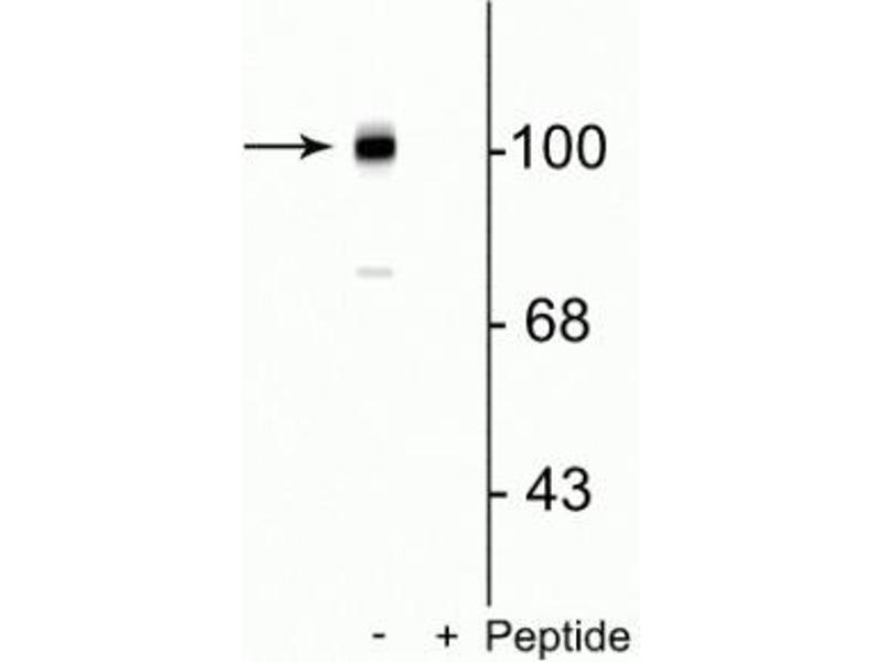 - Specific for the ~102 kDa mGluR7 protein phosphorylated at Ser862. Immunolabeling is blocked by preadsorption of antibody with the phospho-peptide used as antigen but not by the corresponding dephosphopeptide.