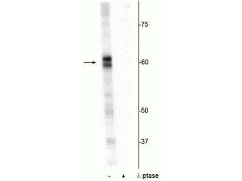 - Specific for endogenous levels of the ~60 kDa PRAS40 protein phosphorylated at Thr356. The immunolabeling is completely eliminated by treatment with λ-phosphatase.