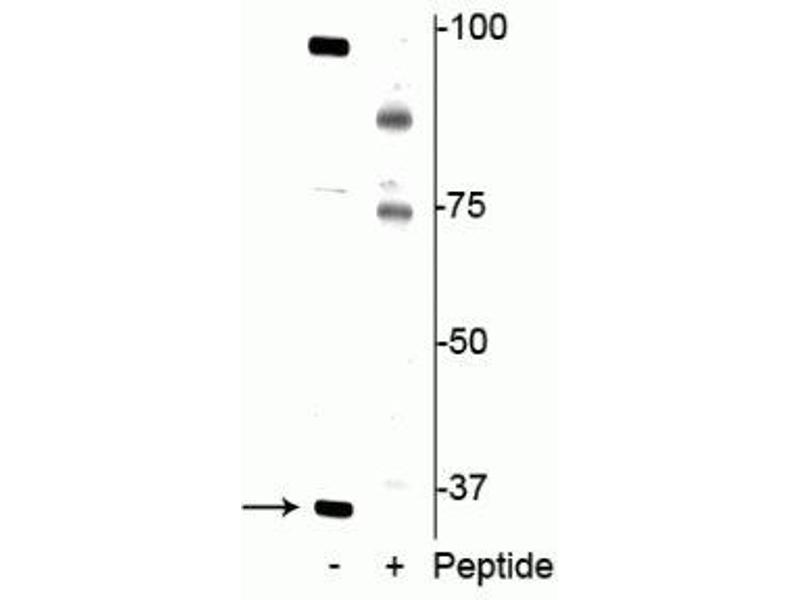 - Specific for endogenous levels of the ~34 kDa REDD1 phosphorylated at Thr23/25. Immunolabeling is blocked by preadsorption with the phosphopeptide used as antigen, but not by the corresponding non-phosphopeptide.