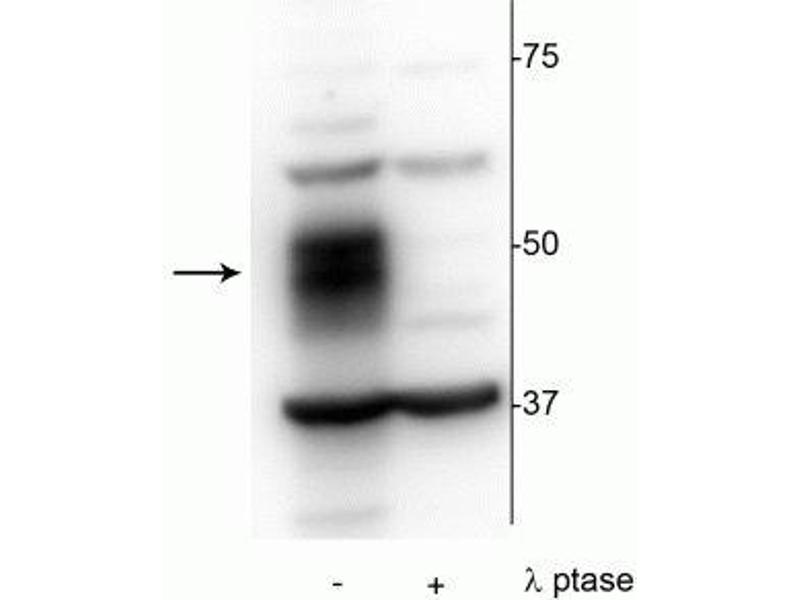- Specific for endogenous levels of the ~51 kDa MEF2C protein phosphorylated at Ser222. Immunolabeling is completely eliminated by treatment with λ-phosphatase.