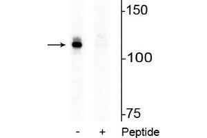 - Specific for endogenous levels of the ~110k AR protein phosphorylated at Ser94. Immunolabeling is blocked by preadsorption of antibody with the phospho-peptide that was used to generate the antibody but not by the corresponding dephospho-peptide.