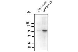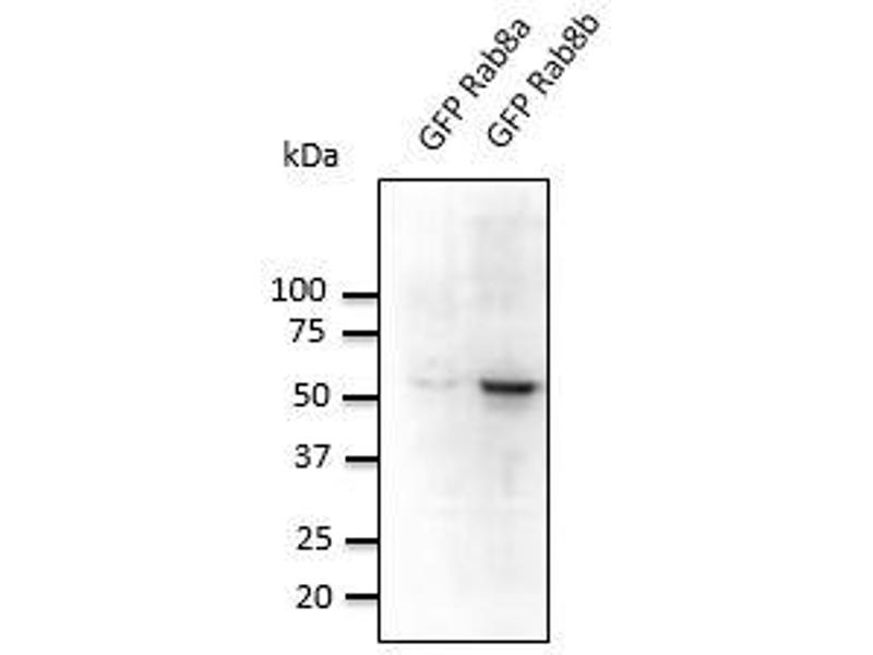 - Detects Rab8b protein in transfected cells with GFP-Rab8b cds by Western blot. This Ab is specific for Rab8b. It does not recognize Rab8a.