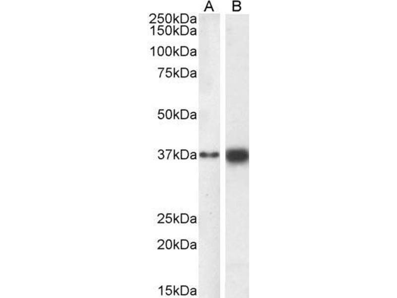 Western Blot: Approx 40 kDa band observed in HEK293 and MCF7 cell lysates and in nuclear lysates of cell line MCF7 (calculated MW of 34.3 kDa according to )NP_003097.1). This molecular weight is routinely observed by other sources. Recommended concentrati
