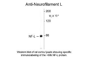 Anti-Neurofilament L antibody is tested for use in Western Blotting and IF. Specific conditions for reactivity should be optimized by the end user. Expect a band of approximately 68 kDa in size corresponding to the NF-L proteins in Western blots in the appropriate cell lysate or extract.