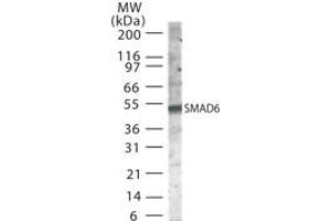 - SMAD6 Antibody was produced from whole rabbit serum prepared by repeated immunizations with a peptide corresponding to two internal amino acid sequences in the human SMAD6 protein.