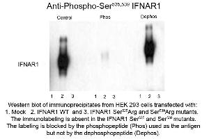 Background: Interferon alpha Receptor Type I pS535/pS539 Antibody detects Interferon alpha Receptor Type I phopshorylated at positions S535/S539. Interferons are widely used therapeutic agents because of their anti tumor and antiviral effects and because of their modulatory effects on the immune system. These cytokines produce their effects by binding to the Type 1 Interferon-α Receptor (IFNAR1). Down regulation of this receptor plays a key role in determining the magnitude and duration of cytokine signaling. This down regulation is thought to be influenced by phosphorylation of Serine 535 and 539 in the IFNAR1. Therefore, Interferon alpha Receptor Type I phospho S535/phospho S539 antibody is ideal for investigators involved in Cell Signaling, Virology, Immunology and Cancer Research.