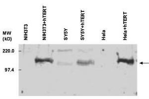 Synonyms: rabbit anti-TERT antibody, rabbit anti-Telomerase catalytic subunit antibody, hTERT, Telomerase reverse transcriptase, HEST2, Telomerase-associated protein 2, TP2, EST2, TCS1, TRT