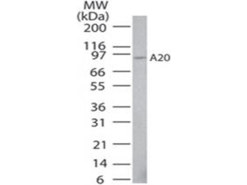 Background: Anti-A20 antibody detects human A20. A20 (TNFAIP3) is an important regulator of proinflammatory signaling pathways, including NK-kB sginaling. A20 is upregulated through NF-kB (p50/p55) activation, and subsequently down regulates NF-kB through its dual function as a deubiquitinase and ubiquitin ligase. The A20 monoclonal antibody has been instrumental in discovering various nuances of NF-kB regulation and key to defining A20 biology. Anti-A20 antibody is ideal for investigators involved in NFkappaB and Signaling research.