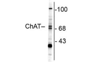 Anti-ChAT antibody has been tested in western blot and IHC and is suitable for use in ELISA. Specific conditions for reactivity should be optimized by the end user. Expect a ~ 68/70 kDa band corresponding to choline acetyltransferase protein by Western Blot in the appropriate lysate or tissue.