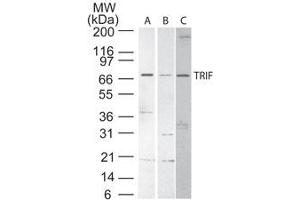 - TRIF Antibody was produced from whole rabbit serum prepared by repeated immunizations with a synthetic peptide corresponding to internal amino acids of the mouse protein TRIF.