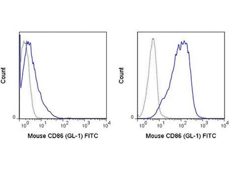 Background: Anti-CD86 reacts with mouse CD86, also known as B7-2, an 80 kDa cell surface protein which is a ligand for CD28, a co-stimulatory receptor for the T cell receptor (TCR). CD28 can also bind a second B7 ligand known as CD80 (B7-1). Both CD80 and CD86 are expressed on activated B cells and antigen-presenting cells. These ligands trigger CD28 signaling in concert with TCR activation to drive T cell proliferation, induce high-level expression of IL-2, impart resistance to apoptosis, and enhance T cell cytotoxicity. The interaction / co-stimulatory signaling between the B7 ligands and CD28 provides crucial communication between T cells and B cells or APCs to coordinate the adaptive immune response. The GL-1 antibody may be used as a marker for CD86 expression on B cells, macrophages, and dendritic cells.