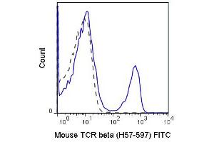 Background: The H57-597 antibody is specific for the beta chain of the mouse T cell Receptor (TCR). This cell surface protein combines with a second protein chain (alpha chain) to form the alpha-beta TCR that is expressed by NK1.1+ thymocytes, NKT cells, and the majority of peripheral T cells. A small number of T cells may express an alternative heteromer of gamma and delta protein chains, known as the gamma-delta TCR. These receptors participate in a complex with CD3, and with the co-receptors CD4 or CD8, to recognize and respond to antigens bound to MHC molecules on antigen-presenting cells. Such interactions promote T cell receptor signaling (T cell activation) and can result in a number of cellular responses including proliferation, differentiation, production of cytokines or activation-induced cell death.The H57-597 antibody is used as a phenotypic marker for T cells expressing the alpha-beta TCR. It is also widely used to cross-link surface TCR and thereby mimic TCR-mediated cell activation or induction of apoptosis. The antibody does not cross-react with cells expressing the gamma-delta TCR.