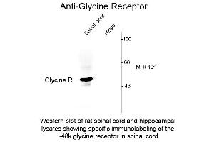 Anti-Glycine Receptor (Rabbit) antibody is tested for use in Western Blotting and IHC. Specific conditions for reactivity should be optimized by the end user. Expect a band of approximately 48 kDa in size corresponding to the alpha 1 and alpha 2 subunits of the glycine receptor in Western Blots of rat spinal cord and brain stem and in cell extracts.