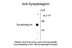 Anti-Synaptotagmin 1 antibody is tested for use in Western Blotting. Expect a band of approximately 65 kDa in size corresponding to synaptotagmin I protein in the appropriate cell lysate or extract. Researchers should determine optimal titers for applications that are not stated below.