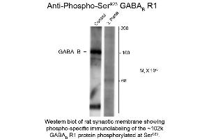 Anti-GABA(B) Receptor 1 pS923 (Rabbit) antibody is tested for use in Western Blotting. Specific conditions for reactivity should be optimized by the end user. Expect a band of approximately 102 kDa in size corresponding to GABA(B) receptor 1 protein phosphorylated at Ser923 in the appropriate cell lysate or extract.