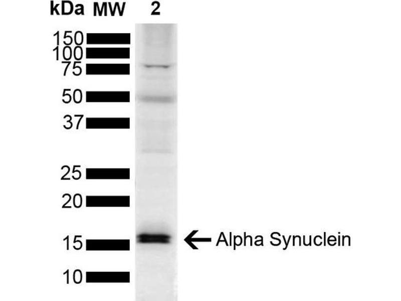 A 1:1000 dilution of ABIN6698747 was sufficient for detection of Alpha Synuclein in 15 μg of mouse Brain cell lysates by ECL immunoblot analysis using goat anti-rabbit IgG:HRP as the secondary antibody.