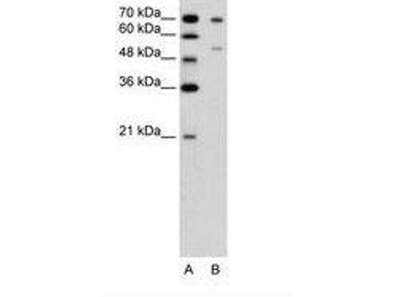 Synthetic peptide located between aa51-100 of human FOXB2 (Q5VYV0, NP_001013757). Percent identity by BLAST analysis: Human, Chimpanzee, Gorilla, Gibbon, Monkey, Galago, Marmoset, Mouse, Hamster, Elephant, Panda, Dog, Bovine, Rabbit, Horse, Pig, Opossum, Guinea pig, Zebra finch, Chicken, Platypus, Lizard, Xenopus, Stickleback, Medaka, Zebrafish (100%), Beetle (92%), Drosophila, Nematode (85%).