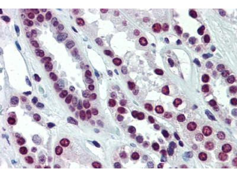 Usage: Immunohistochemistry: This antibody was validated for use in immunohistochemistry on a panel of 21 formalin-fixed, paraffin-embedded (FFPE) human tissues after heat induced antigen retrieval in pH 6.0 citrate buffer. After incubation with the primary antibody, slides were incubated with biotinylated secondary antibody, followed by alkaline phosphatase-streptavidin and chromogen. The stained slides were evaluated by a pathologist to confirm staining specificity. The optimal working concentration for this antibody was determined to be 5 μg/mL. ELISA titer using peptide based assay: 1:62500. Western Blot: Suggested dilution at 1 μg/mL in 5 % skim milk / PBS buffer, and HRP conjugated anti-Rabbit IgG should be diluted in 1:50000 - 100000 as second antibody. -