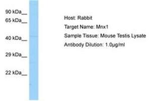 Synthetic peptide located between aa251-300 of mouse Mnx1 (A2RSX2, NP_064328). Percent identity by BLAST analysis: Human, Chimpanzee, Mouse, Rat, Rabbit, Horse, Pig, Guinea pig, Chicken (100%), Gorilla, Orangutan, Gibbon, Galago, Marmoset, Elephant, Panda, Dog, Bovine, Bat, Opossum, Turkey, Zebra finch, Platypus, Lizard, Xenopus, Seabass, Zebrafish (92%), Tunicate (84%).