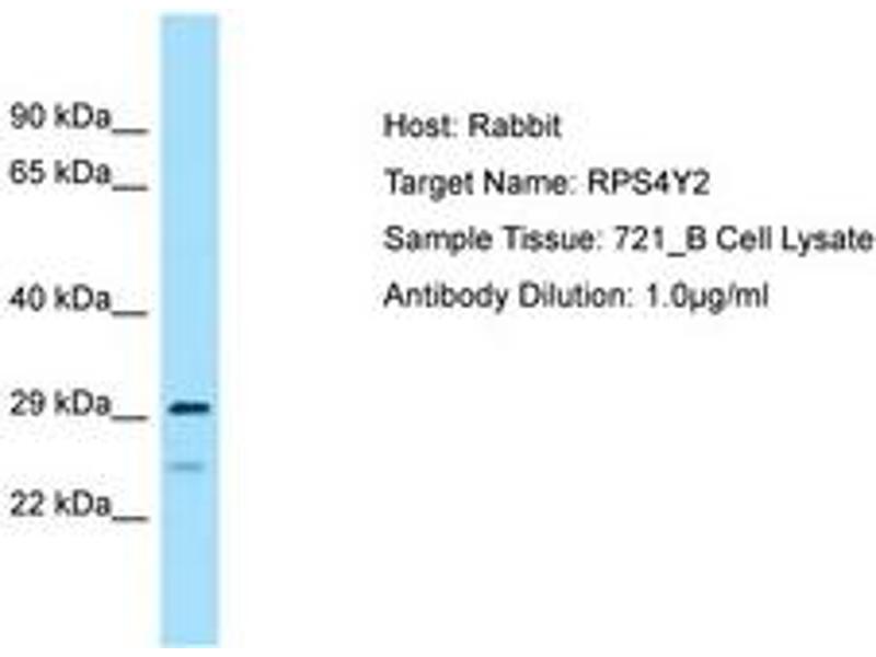 Synthetic peptide from C-Terminus of human RPS4Y2 (Q8TD47, NP_001034656). Percent identity by BLAST analysis: Human, Chimpanzee, Gorilla, Orangutan, Gibbon, Baboon, Monkey, Marmoset, Mouse, Rat, Hamster, Elephant, Panda, Cat, Bovine, Bat, Horse, Pig, Opossum, Guinea pig, Turkey, Chicken, Lizard, Xenopus, Catfish, Zebrafish, Drosophila (100%), Goat, Stickleback, Medaka, Pufferfish (92%), Trout, Salmon, Pike (90%).
