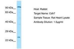 Synthetic peptide located between aa51-100 of rat Cdh7 (Q5DWV2, NP_001012755). Percent identity by BLAST analysis: Human, Chimpanzee, Gorilla, Orangutan, Gibbon, Monkey, Galago, Mouse, Rat, Ferret, Elephant, Panda, Dog, Bovine, Bat, Rabbit, Horse, Opossum, Turkey, Chicken, Lizard (100%), Seabass, Pufferfish (92%), Medaka (91%), Pig, Guinea pig, Platypus, Xenopus, Stickleback (85%).