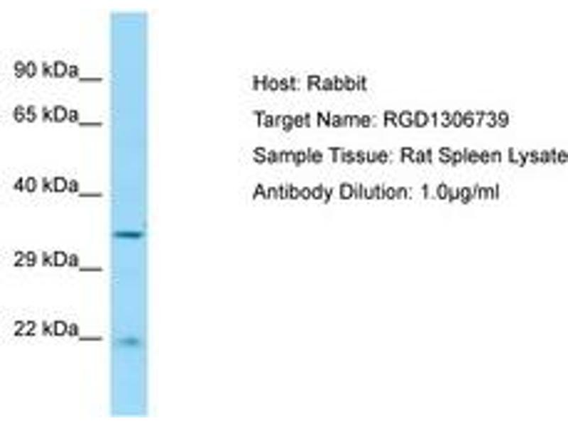 Synthetic peptide from C-Terminus of rat RGD1306739 (D3ZD36, NP_001128048). Percent identity by BLAST analysis: Human, Gorilla, Orangutan, Gibbon, Galago, Marmoset, Rat, Panda, Dog, Rabbit, Horse, Guinea pig (100%), Chimpanzee (92%), Opossum (84%).