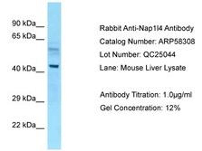 Synthetic peptide located between aa89-138 of mouse Nap1l4 (Q78ZA7, NP_032698). Percent identity by BLAST analysis: Human, Chimpanzee, Gorilla, Orangutan, Gibbon, Monkey, Marmoset, Mouse, Rat, Elephant, Panda, Dog, Bovine, Rabbit, Horse, Pig, Guinea pig (100%), Bat (92%), Opossum (85%).