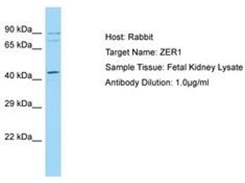 Synthetic peptide from C-Terminus of human ZER1 (Q7Z7L7, NP_006327). Percent identity by BLAST analysis: Human, Chimpanzee, Gorilla, Orangutan, Gibbon, Monkey, Galago, Marmoset, Elephant, Panda, Dog, Bovine, Horse, Pig, Opossum, Guinea pig, Turkey, Zebra finch, Chicken (100%), Mouse, Rat, Bat (92%), Rabbit (85%).