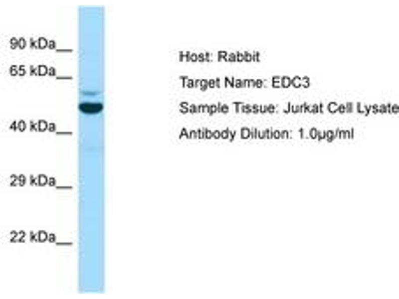 Synthetic peptide located between aa175-224 of human EDC3 (Q96F86, NP_079359). Percent identity by BLAST analysis: Human, Chimpanzee, Gorilla, Orangutan, Gibbon, Monkey, Galago, Marmoset, Mouse, Rat, Elephant, Panda, Dog, Bovine, Bat, Rabbit, Pig, Opossum, Guinea pig (100%), Horse, Turkey, Zebra finch, Chicken, Lizard (92%), Zebrafish (86%), Xenopus, Pufferfish (85%).