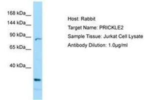 Synthetic peptide from C-Terminus of human PRICKLE2 (Q7Z3G6, NP_942559). Percent identity by BLAST analysis: Human, Chimpanzee, Gorilla, Orangutan, Gibbon, Monkey, Galago, Marmoset, Mouse, Rat, Elephant, Panda, Dog, Bovine, Bat, Rabbit, Horse, Pig, Opossum, Guinea pig, Turkey, Zebra finch, Chicken, Platypus, Lizard (100%), Xenopus (92%), Seabass, Zebrafish (85%).