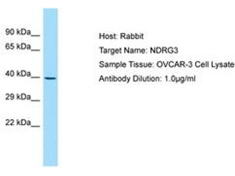 Synthetic peptide from C-Terminus of human NDRG3 (Q9UGV2, NP_071922). Percent identity by BLAST analysis: Human, Chimpanzee, Gorilla, Orangutan, Gibbon, Monkey, Marmoset, Mouse, Rat, Rabbit (100%), Galago, Panda, Dog, Bovine, Bat, Guinea pig (92%), Horse (85%).